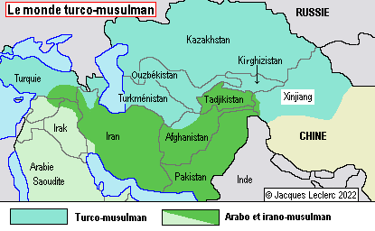 De plus, la plupart des pays situés à l'ouest du Xinjiang, que ce soit en Asie centrale ou l'Asie du Sud, abritent des personnes de religion musulmane, qui utilisent elles aussi l'alphabet arabo-persan. Ainsi, culturellement, les Ouïghours ont beaucoup plus d'affinités avec les turcophones et les autres musulmans qu'avec les sinophones qui, au surplus, ont développé une aversion particulière à l'égard de l'islam. Pour la plupart des Ouïghours, la Chine est un pays étranger. Ce sont les aléas de l'histoire qui ont fait que le Xinjiang a été annexé à la Chine plutôt que de devenir un Ouïghouristan, comme c'est le cas en Asie centrale, depuis la disparition de l'URSS. Si ce n'avait été de la Chine, c'est l'Union soviétique que se serait emparée du Xinjiang. |
