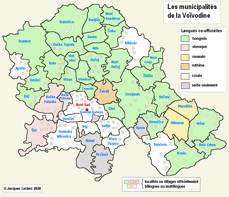 La carte ci-dessous présente les 45 municipalités de la Voïvodine (voir le tableau complet des municipalités). Lors que le fond d'une municipalité est blanc, cela signifie que celle-ci n'a qu'une langue officielle, mais que l'une ou plusieurs de ses localités qui la composent peuvent reconnaître une ou plus d'une langue officielle.