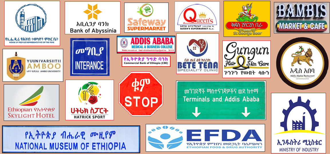 L'affichage, tel qu'il se présente en Éthiopie, est souvent bilingue, c'est-à-dire en amharique et en anglais, la langue officielle étant généralement placée au-dessus des inscriptions en anglais. Il existe néanmoins des inscriptions unilingues en amharique ou en anglais. Cette façon de faire faciliterait, selon le gouvernement, la lecture chez les touristes visitant l'Éthiopie.