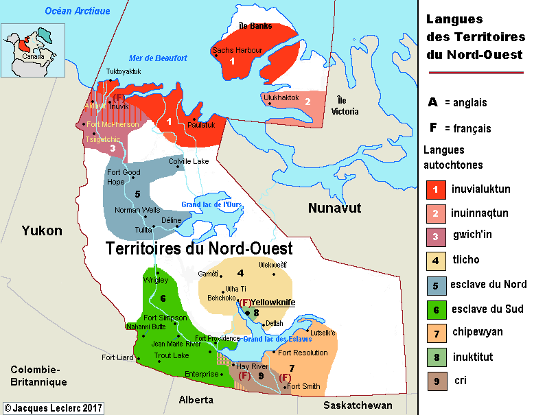 Capitale: Yellowknife Population: 40 545 (2021) Langues officielles: anglais et français (de jure) + neuf langues autochtones Groupe majoritaire: anglais (75,9 %) Groupes minoritaires: français (2,7 %), autres langues (17,3 %) Système politique: territoire fédéral du Canada depuis 1870 Articles constitutionnels (langue): art. 14, 16-23, 55, 57 de la Constitution de 1982 Lois linguistiques: Loi sur les langues officielles (1988); Loi électorale (1988); Loi sur l'adoption de la version française des lois et textes réglementaires (1988); Loi sur l'exécution réciproque des jugements (1988); Loi sur le jury (1988); Loi sur l'éducation des Territoires du Nord-Ouest (1996); Loi sur la révision des lois (1996); Règlement sur l'instruction en français langue première (1996). |