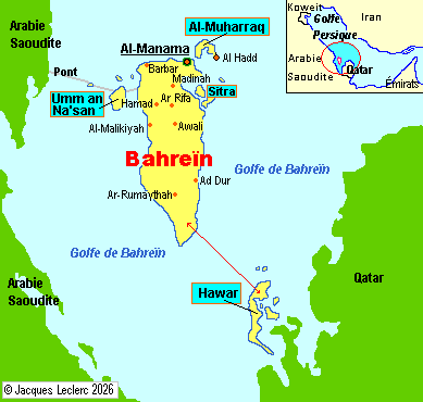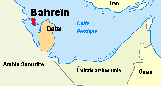 Le Bahreïn, appelé officiellement l'État de Bahreïn, est un minuscule pays constitué de 33 îles proches de la côte orientale du golfe Persique. Situé entre la presqu'île de Qatar à l'est et la côte d'Arabie à l'ouest, Bahreïn, avec une superficie de 620 km² de terres, est vraiment le plus petit État de la péninsule Arabique. Le pays (Al-Bahrayn) porte le nom de la principale île de l'archipel (562 km²), qui signifie en arabe «les deux mers». Depuis 1986, cette île est reliée par un pont routier de quelque 25 km de longueur à l'Arabie Saoudite (qui a payé entièrement l'ouvrage de 1,2 milliard de dollars). Les autres îles importantes (toutes reliées par un pont à l'île de Bahrayn) sont Muharraq au nord-est, Umm an Na'san à l'ouest, Sitra à l'est, auxquelles il faut ajouter l'île de Hawar au sud près du Qatar. |