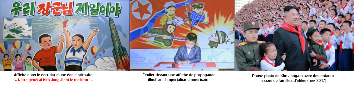Les forces armées ont toujours joué un rôle essentiel en Corée du Nord, non seulement en tant que garants de la sécurité nationale, mais elles ont également été un acteur politique de premier ordre la la politique et sur l'éducation. De façon générale, les enfants nord-coréens sont éduqués dès l'école primaire à l'idéologie militariste. Depuis 1948, tous les enfants, comme leurs parents, doivent se préparer à la guerre qui ne saurait être qu'imminente, soit de la part de la Corée du Sud, soit de la part des États-Unis. D'ailleurs, les Sud-Coréens se moquent ouvertement de la formation militariste donnée aux enfants par leur voisins. Les photos ci-contre veulent montrer la différence entre les écoliers en Corée du Nord par comparaison à ceux de la Corée du Sud, bien que ce ne soit pas tous les petits Nord-Coréens qui portent l'uniforme militaire. |