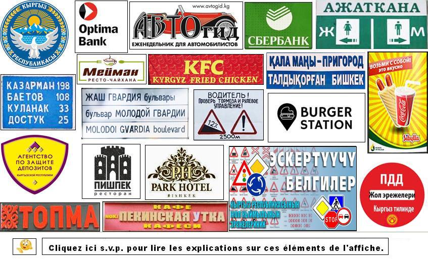 En réalité, les enseignes russes sont omniprésentes à Bichkek, ce qui restreint considérablement l'usage de messages unilingues en kirghiz. Il existe aussi de nombreux mots en langue étrangère, notamment des mots anglais très courants du genre "fast food" («restauration rapide»), "fashion" («mode»), "pizzeria", etc. En fait, seules les entreprises et les institutions de l'État soumises à la réglementation affichent des inscriptions en kirghiz. Étant donné que les messages temporaires ne sont pas soumis à la loi, certains messages peuvent se retrouver en anglais: "Back in 5 minutes" («retour dans 5 minutes»), "Open" («ouvert»), "Close" («fermé»), etc., ce qui réduit encore davantage l'usage du kirghiz.