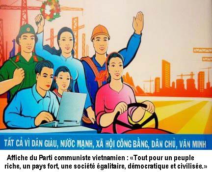 Le Vietnam est un État communiste dirigé par un parti unique, le Parti communiste du Vietnam (PCV ou en vietnamien: Đảng Cộng Sản Việt Nam). Selon l'article 4 de la Constitution de 2013, le Parti communiste est l'avant-garde de la classe ouvrière, guidé par le marxisme-léninisme et impose l'exclusivité du pouvoir politique dans la société vietnamienne. L'opposition politique est interdite et tout effort de proposer le multipartisme est réprimé par le Parti et la Sécurité vietnamienne (cong an). Dans les villes et les provinces, tous les postes de direction sont détenus par des membres du Parti; il en va de même pour les ministres qui sont systématiquement membres du Comité central. Les députés de l'Assemblée nationale sont tous membres du Parti.