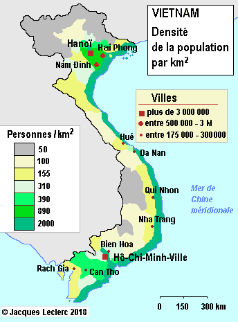 Paradoxalement, ce sont ces régions qui sont les moins peuplées: la Région du Nord-Est, la Région du Nord-Ouest et la Région des montagnes centrales. Bref, la population du Vietnam est surtout concentrée dans les plaines, le long des côtes, tandis que les minorités ethniques se trouvent dans les montagnes, dans l'arrière-pays. Les régions montagneuses du Centre et celles du Nord abritent une soixantaine de minorités ethniques représentant 15 % de la population, c’est-à-dire plus de dix millions d’individus. |