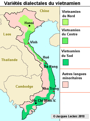 Capitale: Hanoi Population: 96,5 millions (2018) Langue officielle: vietnamien Groupe majoritaire: vietnamien (84 %) Groupes minoritaires: près d'une centaine de langues dont le khmer, le cham, le thaï, le hmong, etc. Système politique: république socialiste Articles constitutionnels (langue): art. 5, 25, 42, 58, 61, 70, 75, 77 et 82 de la Constitution de 2013
