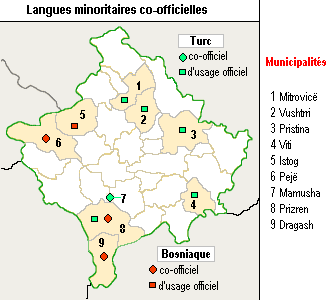 langues officielles de la république du Kosovo, d'autres langues parlées par les nationalités peuvent être co-officielles dans les municipalités où résident les locuteurs de ces langues. C'est ainsi que le bosniaque et le turc sont reconnus comme «langue d'usage officiel» dans certaines municipalités: