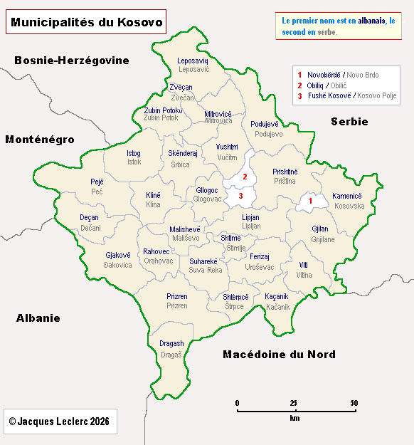 On peut aussi consulter un tableau représentant la composition ethnique de chacune des municipalités: «La répartition des nationalités dans les municipalités du Kosovo (2011)».
