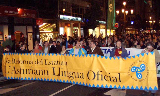 afin de protéger et promouvoir l’asturien, mais les résultats se font attendre, bien que des améliorations sensibles aient été réalisées. De son côté, la Xunta pola Defensa de la Llingua Asturiana (Junte pour la défense de la langue asturienne), un organisme voué à la promotion de l'usage et de l'enseignement de l'asturien, organise des manifestations pour faire adopter l'asturien comme langue co-officielle. Cette association a été créée en 1984 et, depuis lors, propose périodiquement diverses activités pour impliquer la société asturienne dans la défense de la langue. Quant à l'Empresarios y Profesionales EPA, un organisme privé regroupant des chefs d'entreprise et des professionnels, elle œuvre à la promotion de l'asturien dans le monde du commerce et des affaires. Cet organisme a souvent fait campagne à plusieurs occasions et a reçu des subventions de la part du gouvernement autonome.Mentionnons aussi le Conceyu Abiertu pola Oficialidá (CAO: «Conseil en faveur de l'officialité»), fondé en 2004, une association apolitique regroupant des syndicats, des partis politiques locaux et des partisans favorisant le statut co-officiel de l'asturien. Le CAO a été créé par la Xunta pola Defensa de la Llingua Asturiana («Junte pour la défense de la langue asturienne») et est actuellement appuyé par plus d'une centaine d'organisations politiques, syndicales, culturelles, professionnelles, sportives, etc. Le CAO cessera d'exister le jour où l'asturien obtiendra un statut officiel avec le castillan. D'ici là, l'organisme veut développer «un travail pédagogique et de conscientisation sociale» pour que le caractère co-officiel de l'asturien soit mené à bien à partir d'un vaste consensus social.