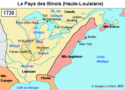 Évidemment, le Pays des Illinois est un espace colonial beaucoup moins connu que les territoires de la vallée du Saint-Laurent (le Canada) et de l'Acadie, et même de la région du Mississipi avec les villes de La Nouvelle-Orléans et de Mobile. La Haute-Louisiane, située à la charnière du Canada et de la Basse-Louisiane, fut appelée «Pays des Illinois» en raison de la présence d'une puissante confédération autochtone, les Illinois. |