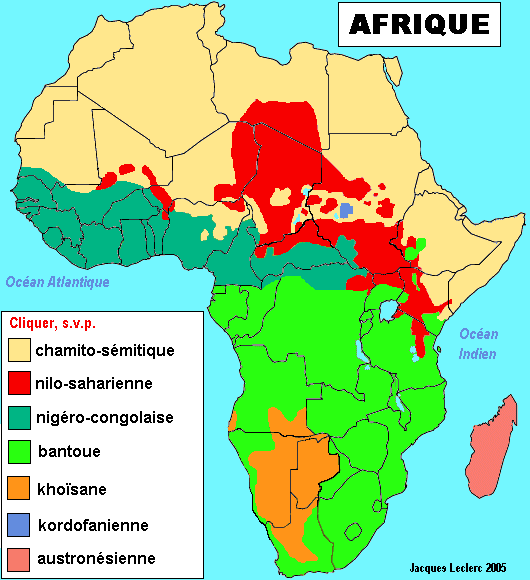 - Famille afro-asiatique - Famille nigéro-congolaise - Famille bantoue - - Famille nilo-saharienne - Famille khoïsane - Famille kordofanienne - Famille austronésienne -